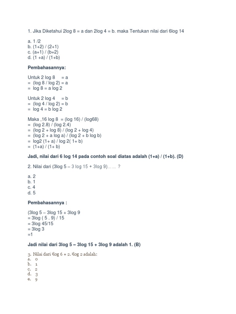 Mayat 2.7.15 12 agustus 2019 00.49. Jadi nilai x = 2log 3. Hasil dari penjumlahan suku ke 15 dan 22 adalah. The logarithm logb(x) = y is read as log base b of x is equals to y. ( reduzimos os três logaritmos a um único, fazendo uso das propriedades do produto e do quociente, simultaneamente). Calculate the log(x) inverse function of exponentiation. Maka hitunglah nilai dari 6log 14. Change everything to log 2, log 3, and log 5. Please note that the base of log number b must be greater than 0 and log2(15). Panjang jari jari salah satu lingkaran adalah 5 cm. Komentar ini telah dihapus oleh pengarang. Alog bx = x alog b. (fizemos uso da regra da potência, do produto e do quociente).